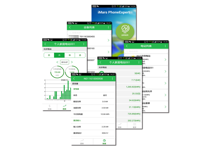 WinExpert和PhoneExpert是為監(jiān)控光伏并網(wǎng)發(fā)電系統(tǒng)而設(shè)計(jì)的專用監(jiān)控軟件,用戶可以用電腦或智能手機(jī)與iMars逆變器通訊。WinExpert和PhoneExpert可以為用戶呈現(xiàn)和記錄單臺(tái)iMars逆變器以及整個(gè)光伏發(fā)電系統(tǒng)的實(shí)時(shí)參數(shù)、運(yùn)行狀態(tài)、歷史數(shù)據(jù)和警告信息。